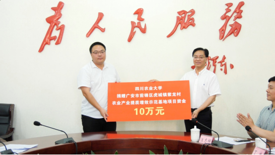 陈代文代表2138cn太阳城集团向广安市前锋区虎城镇紫龙村农业产业提质增效示范基地捐赠了10万元项目资金。