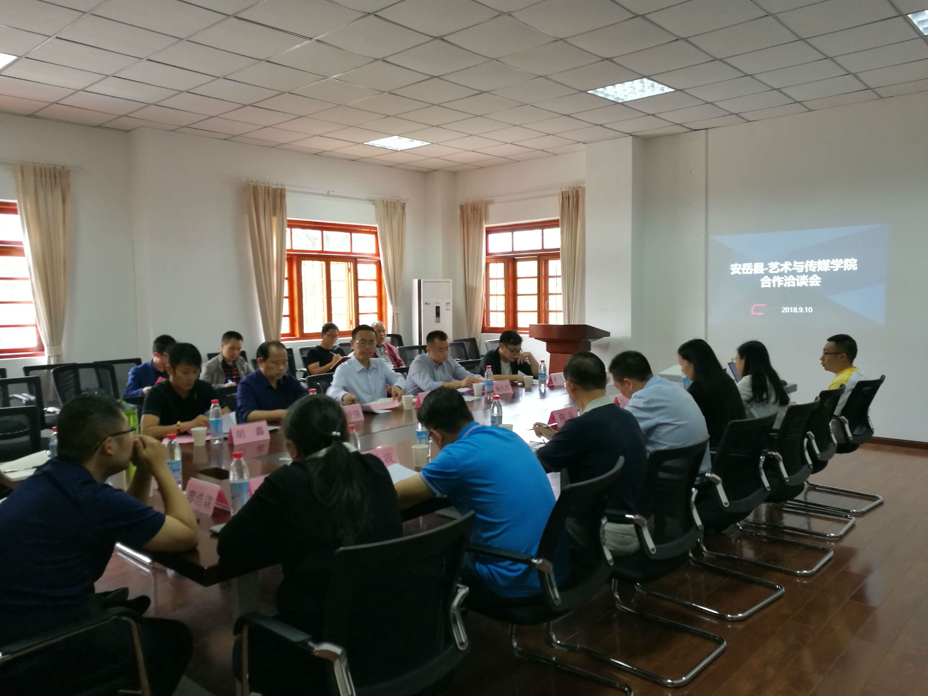 9月10日,资阳市安岳县人民政府副县长谢贻奎,商务局局长杨久红、副局长谢培强,安岳县电子商务协会副秘书长曾峥,安岳艾鑫米商贸有限公司经理胡鑫一行5人来校商讨合作事宜。艺术与传媒学院党委书记向兵、副院长江霞、副书记胡永波及艺术与传媒学院各办公室(系、中心)主任,我校新农村发展研究院推广科科长廖尔华参加会议。会议由胡永波主持。