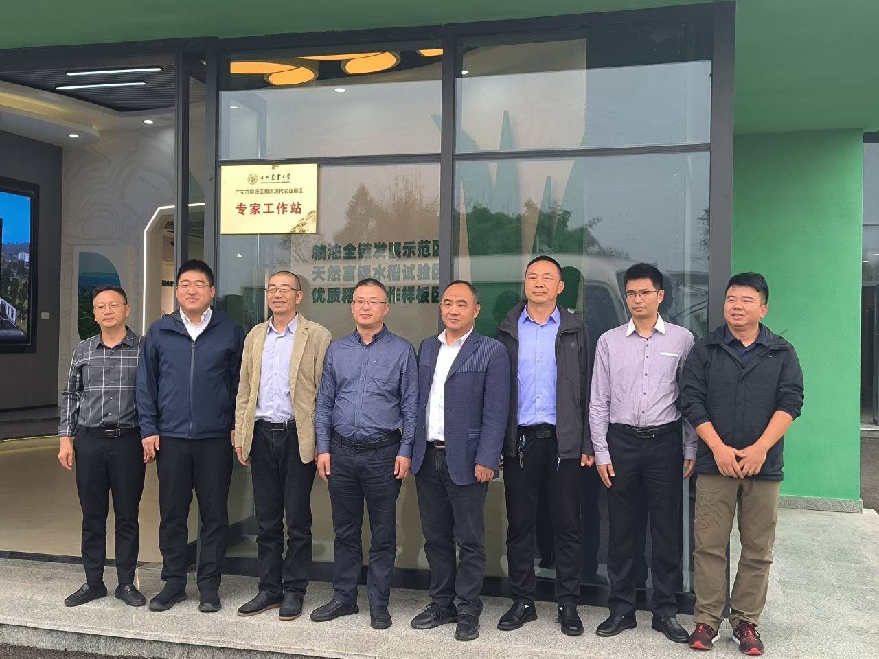 在广安市观阁镇七谷村前锋区粮油现代农业园区综合农事服务中心,在前锋区副区长鲁崇兵带领下,大家参观当地特色农业、联农带农点和农业产业链示范,随后何祖锋、王显祥、张皓博、鲁崇兵为2138cn太阳城集团前锋区粮油现代农业园区专家工作站揭牌。