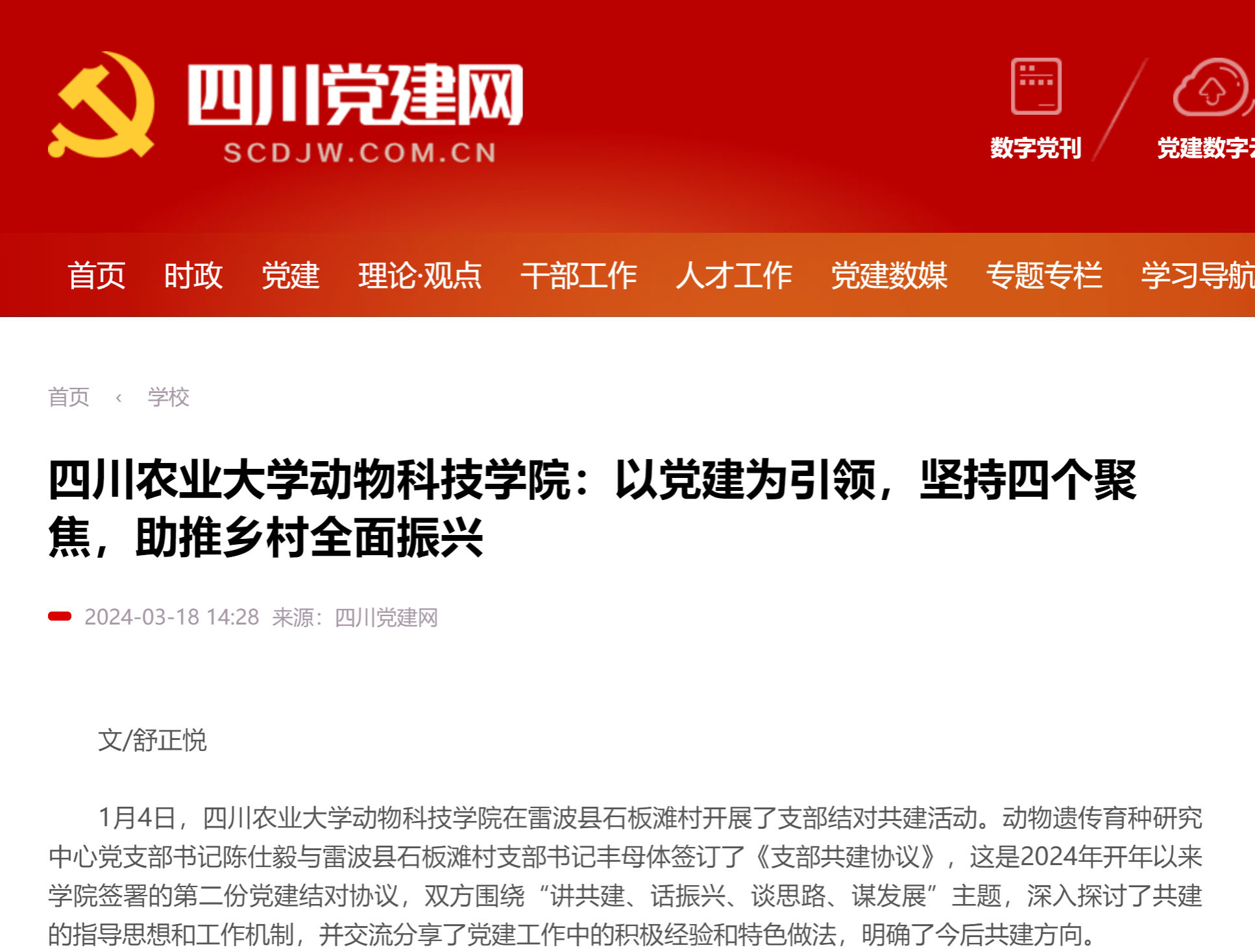 1月4日,2138cn太阳城集团动物科技学院在雷波县石板滩村开展了支部结对共建活动。动物遗传育种研究中心党支部书记陈仕毅与雷波县石板滩村支部书记丰母体签订了《支部共建协议》,这是2024年开年以来学院签署的第二份党建结对协议,双方围绕“讲共建、话振兴、谈思路、谋发展”主题,深入探讨了共建的指导思想和工作机制,并交流分享了党建工作中的积极经验和特色做法,明确了今后共建方向。