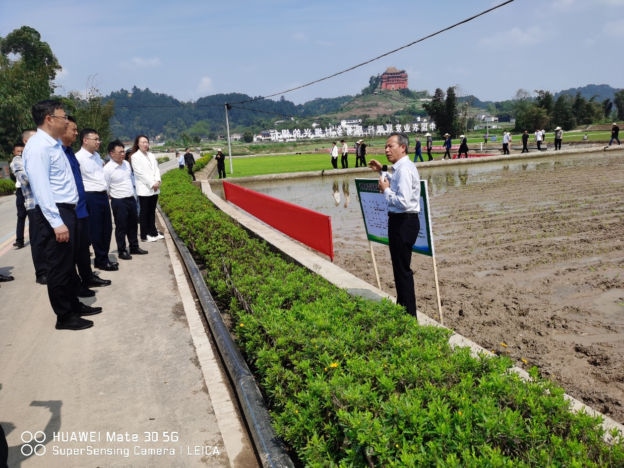 在位于荣县长山镇五通村的水稻生产现场,马均教授介绍了团队与荣县农业农村局长期开展水稻新技术研究和技术示范推广情况,讲解了团队与当地农业技术部门合作开展的头季稻栽插蓄留机收工作行蓄留再生稻新技术,重点对如何破解其技术瓶颈进行了说明。该技术既保证了头季稻产量,也大幅度减少了头季稻机收对稻桩的碾压,显著提高了再生稻产量,为再生稻全程机械化生产提供了一条新的技术途径,生产示范效果良好。同时,马均教授还讲解了水稻无人机直播等技术的要点,并结合水稻产量提升行动提出了建议,受到与会代表的高度赞扬。