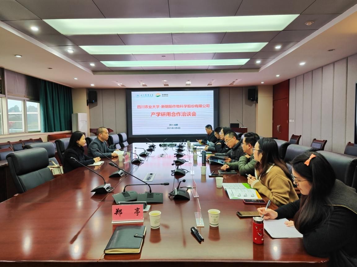 洽谈会上,任丹与赖晓阳详细介绍了公司发展历程及核心业务,重点展示了其在生物农药、作物健康管理等领域的技术研发成果。任丹表示:“新朝阳作为国内农业生物技术领军企业,长期专注绿色农业投入品研发与推广,始终致力于绿色农业技术创新,自2011年以来就与川农大建立了良好的合作关系。期待通过校企合作,推动科研攻关与产业需求深度融合,为现代农业高质量发展注入新动能。”我校农学院副院长王强、资源学院副院长李冰分别就学院学科建设、科研方向、研究生培养及社会服务成果进行阐述。农学院在作物遗传育种、病虫害防治等领域的优势,与资源学院在土壤修复、生态农业等方向的研究积累,为双方合作提供了广阔空间。