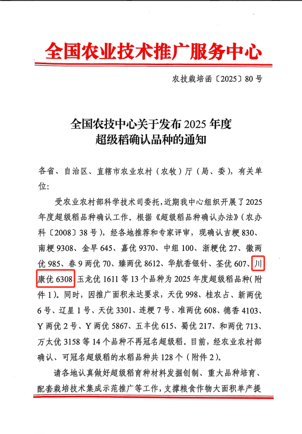 近日,农业农村部全国农业技术推广服务中心发布了2025年度超级稻确认品种名单,由水稻研究所与四川省农业科学院作物研究所联合选育的品种川康优6308成功入选,成为本年度全国13个新认定的超级稻品种之一。此次,整个西南稻区仅3个品种被确认为超级稻,这一荣誉再次印证了川康优6308在优质、高产和广适性方面的卓越表现。