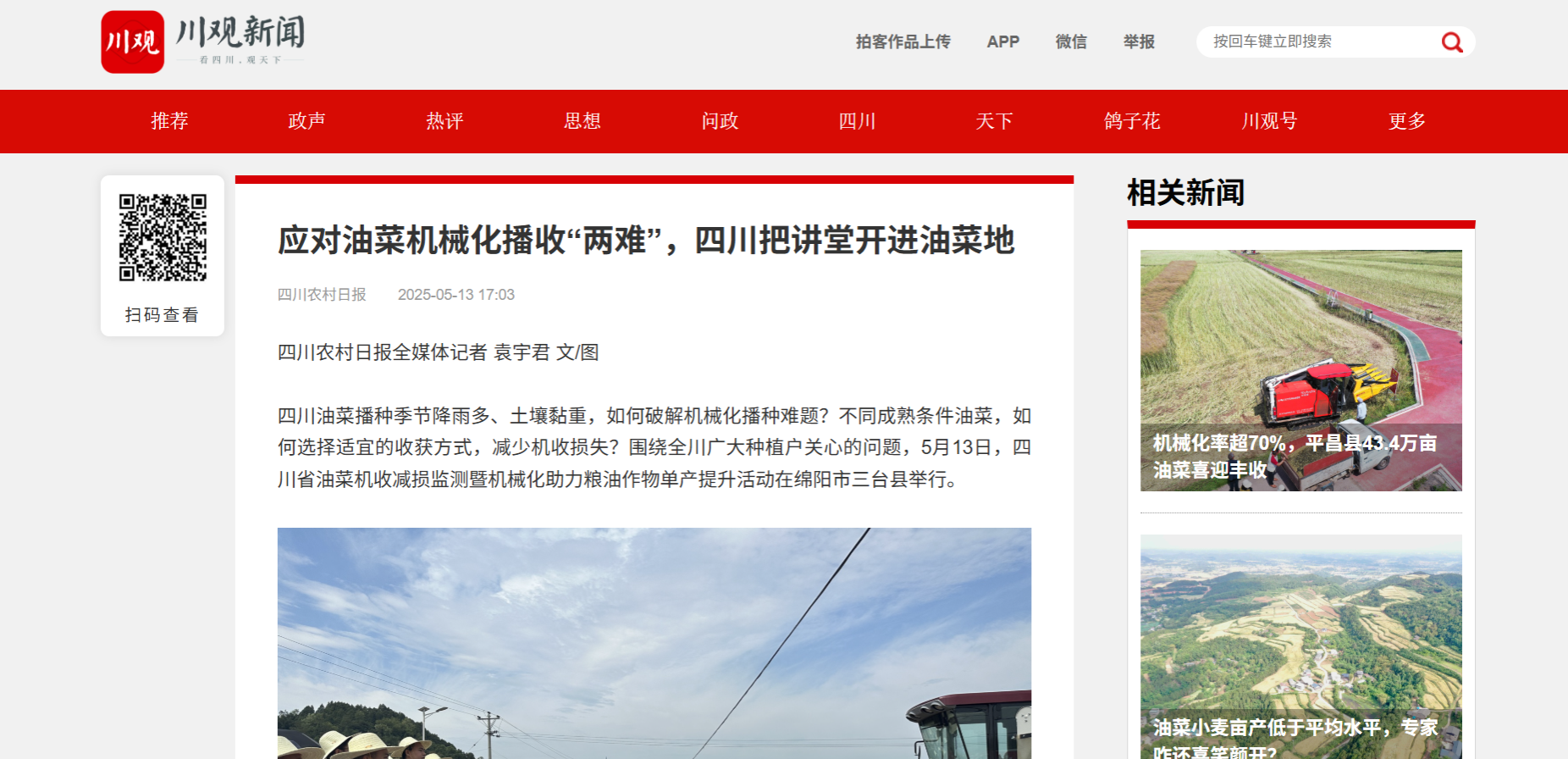四川油菜播种季节降雨多、土壤黏重,如何破解机械化播种难题?不同成熟条件油菜,如何选择适宜的收获方式,减少机收损失?围绕全川广大种植户关心的问题,5月13日,四川省油菜机收减损监测暨机械化助力粮油作物单产提升活动在绵阳市三台县举行。