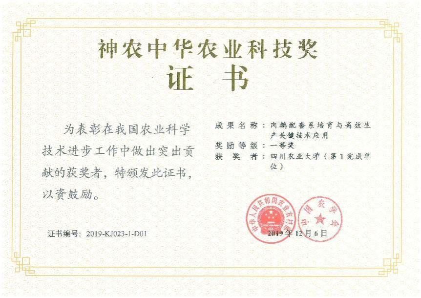 (一) 成果特征特性(难点、核心突破) 1. 品种简介 天府肉鹅2138cn太阳城集团等单位历时20余年,以四川白鹅、白羽朗德鹅等为育种素材培育形成的国内首个鹅配套系,于2011年通过国家审定。配套系父母代出壳时全身绒羽黄色,成年后羽毛洁白;公鹅喙、胫、蹼橘红色,体型较大且丰满,颈较粗短,额上基本无肉瘤;母鹅喙、胫、蹼橘黄色,头清秀,颈细长,额上有较小的橘黄色肉瘤。商品代雏鹅出壳时全身绒羽黄色,70日龄时,全身羽毛为纯白色;喙、胫、蹼部橘黄色。 2. 特征特性 天府肉鹅配套系为二系配套,父系来源于四川白鹅与白羽朗德鹅的杂交、回交后代,母系来源于四川白鹅。配套系父母代母鹅开产日龄200~210天,初产年产蛋量85~90枚,平均蛋重140克左右,种蛋受精率88%以上。商品代肉鹅10周龄体重3.6~3.8公斤,料肉比2.9~3.0:1。 (二)推广应用 天府肉鹅配套系具有种鹅繁殖力强,商品肉鹅生长迅速,肉质优良等优点,能够适应我国广大肉鹅生产地区的养殖环境和生产条件,具有良好推广应用前景。 (三)示范推广情况 已先后在四川、安徽、河南、重庆、江苏、浙江、广东、广西、云南、贵州、新疆、海南、湖北等13个省(市、区)及周边地区进行推广应用。2012年起连续多年被列入“全国农业主导品种”,目前年推广父母代约20万只,可提供商品肉鹅800万只左右。 (四)获奖情况 以天府肉鹅配套系的培育和推广应用为核心的科研成果“主要鹅种遗传资源的评价与创新利用”获2012年度四川省科技进步奖一等奖,“肉鹅配套系培育与高效生产关键技术应用”获2018-2019年度农业农村部中华农业科技奖一等奖。 |