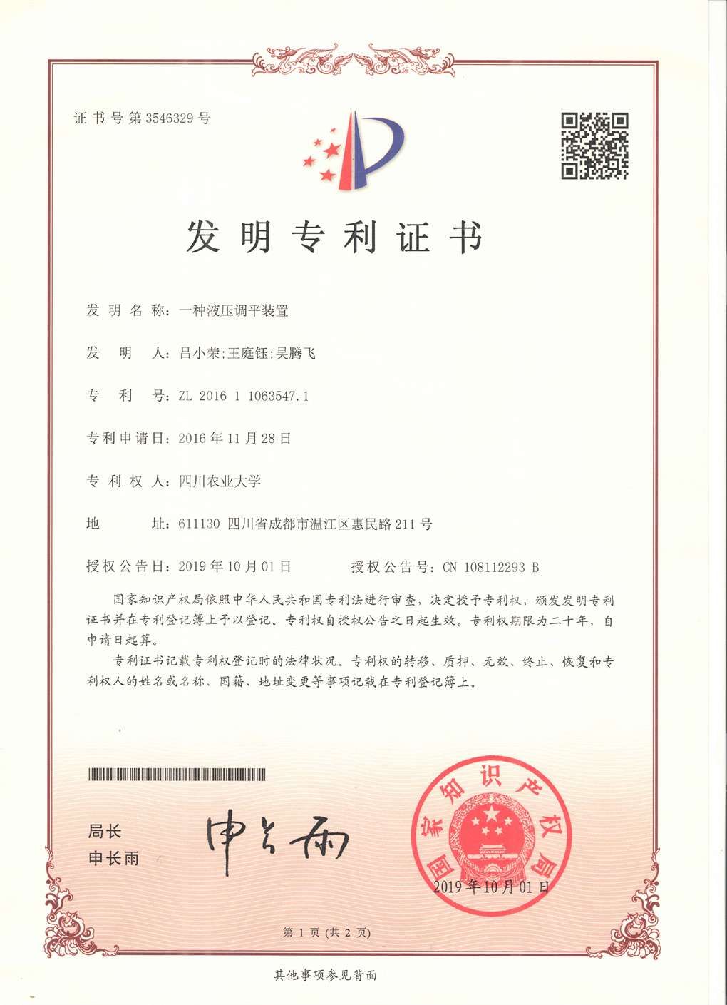 本发明公开了一种液压调平装置,其特征是:设置前液压缸与后液压缸,所述前(后)液压缸固接在原机的底盘上,且分别通过销轴与中层调平板相连;所述中层调平板通过连接件和轴承与上层调平板连接,所述上层调平板与原机的车箱固接;本发明采用6个液压缸较好的实现了中(上)层调平板的前后左右各方位的高度调节,进而完成了车身的调平。本发明适于坡地、起伏地面作业尤其是丘陵山区,有效的提高机具的安全性、稳定性。
