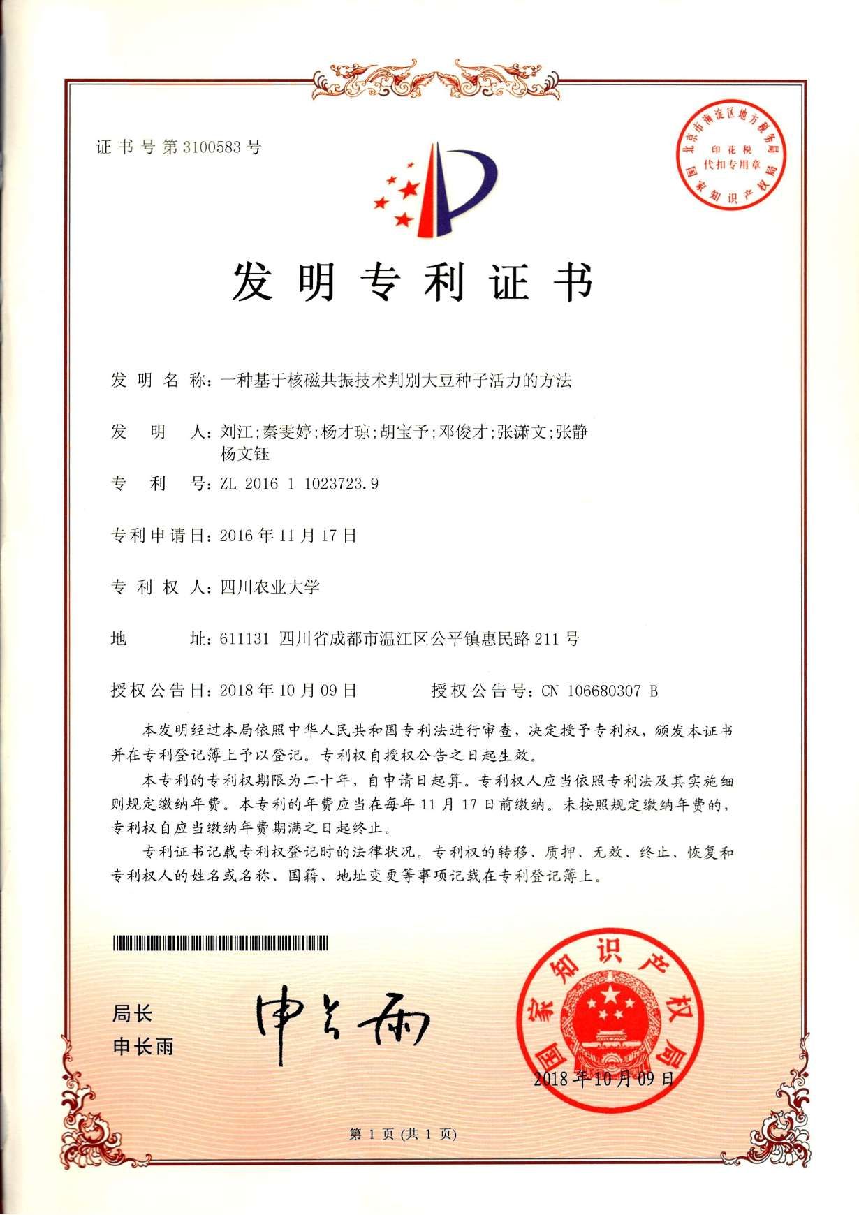 本发明公开了一种基于核磁共振技术判别大豆种子活力的方法,其采用核磁共振波谱技术对大豆种子提取物中的代谢物进行绝对定量分析,得到代谢物归属图谱,并基于建立的偏最小二乘法多元回归模型,筛选特定代谢物,继而利用得到的大豆种子中特定代谢物的绝对含量值判别其活力高低,为大豆种子活力判别及抗老化大豆种质资源的筛选提供参考。本发明操作简单快速、结果可靠,可为具有抗老化潜力的优质大豆种质资源的判定和筛选提供参考。