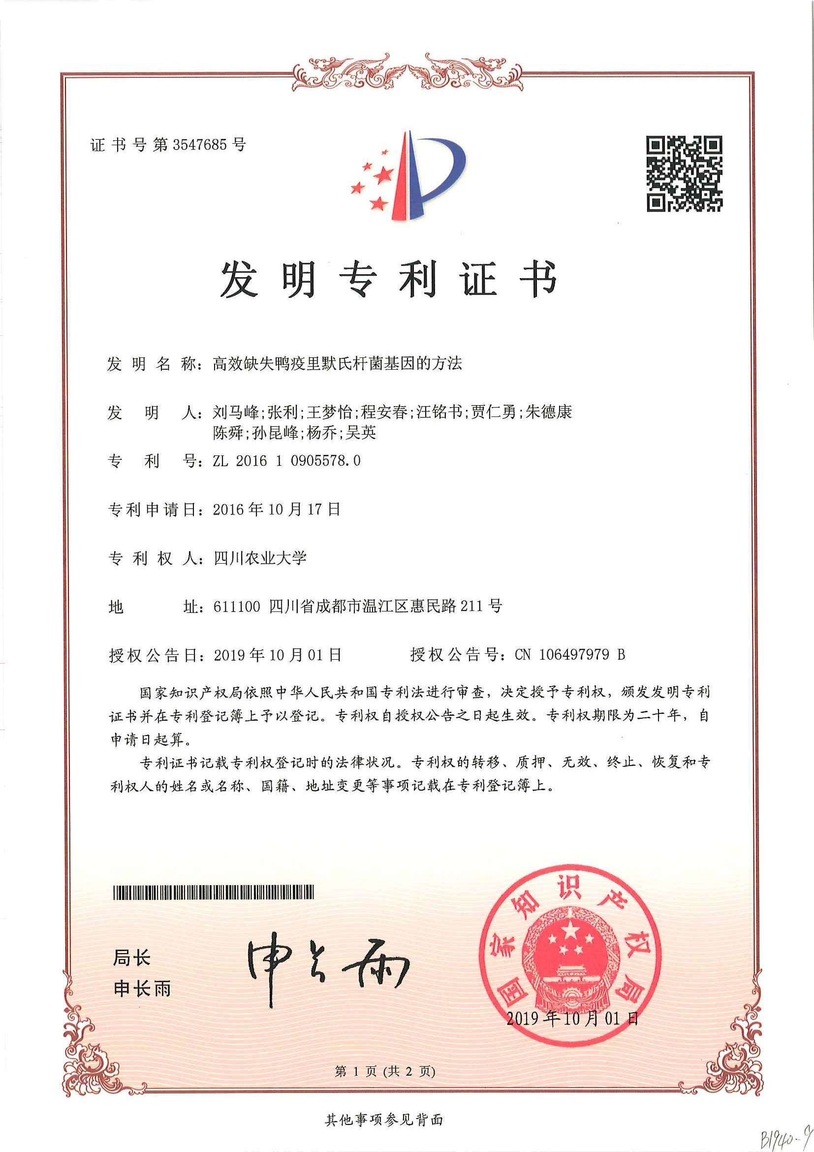 本发明公开了高效缺失鸭疫里默氏杆菌基因的方法,具体方法是将由待缺基因上游片段、抗性基因片段和待缺基因下游片段组成的融合片段通过自然转移转入鸭疫里默氏杆菌,然后用所述抗性基因的抗生素筛选即获得缺失基因的鸭疫里默氏杆菌,该方法简单,将缺失基因构建融合片段后可以直接与宿主菌发生自然交换,并且培养周期短,转化率高,能够高效缺失鸭疫里默氏杆菌基因,为鸭疫里默氏杆菌基因功能及减毒疫苗研制提供了工具。
