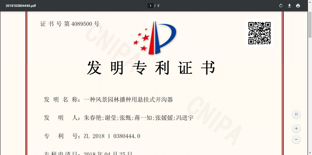 本发明公开了一种风景园林播种用悬挂式开沟器,包括开沟主架,所述开沟主架的上方两端对称安装有两个伸缩圆柱,并且所述开沟主架的下方通过缓冲架连接有悬挂架板,两个所述伸缩圆柱的顶部通过安装座盘与拖拉机相连,并且所述伸缩圆柱之间设置有液压油缸,所述液压油缸的活塞杆通过圆台座与拖拉机相连,并且所述液压油缸的底部设置于开沟主架的凹槽座中,所述缓冲架的外侧一周套有减振弹簧,所述悬挂架板的下方从左到右依次设置有开沟犁刀和开沟刀轮,所述开沟犁刀通过犁柱固定安装于悬挂架板的下表面上,所述开沟刀轮的外侧环处安装有若干刀片,并且所述开沟刀轮通过轮支架与悬挂架板相连,能调节开沟的深度,还提高了开沟效率。